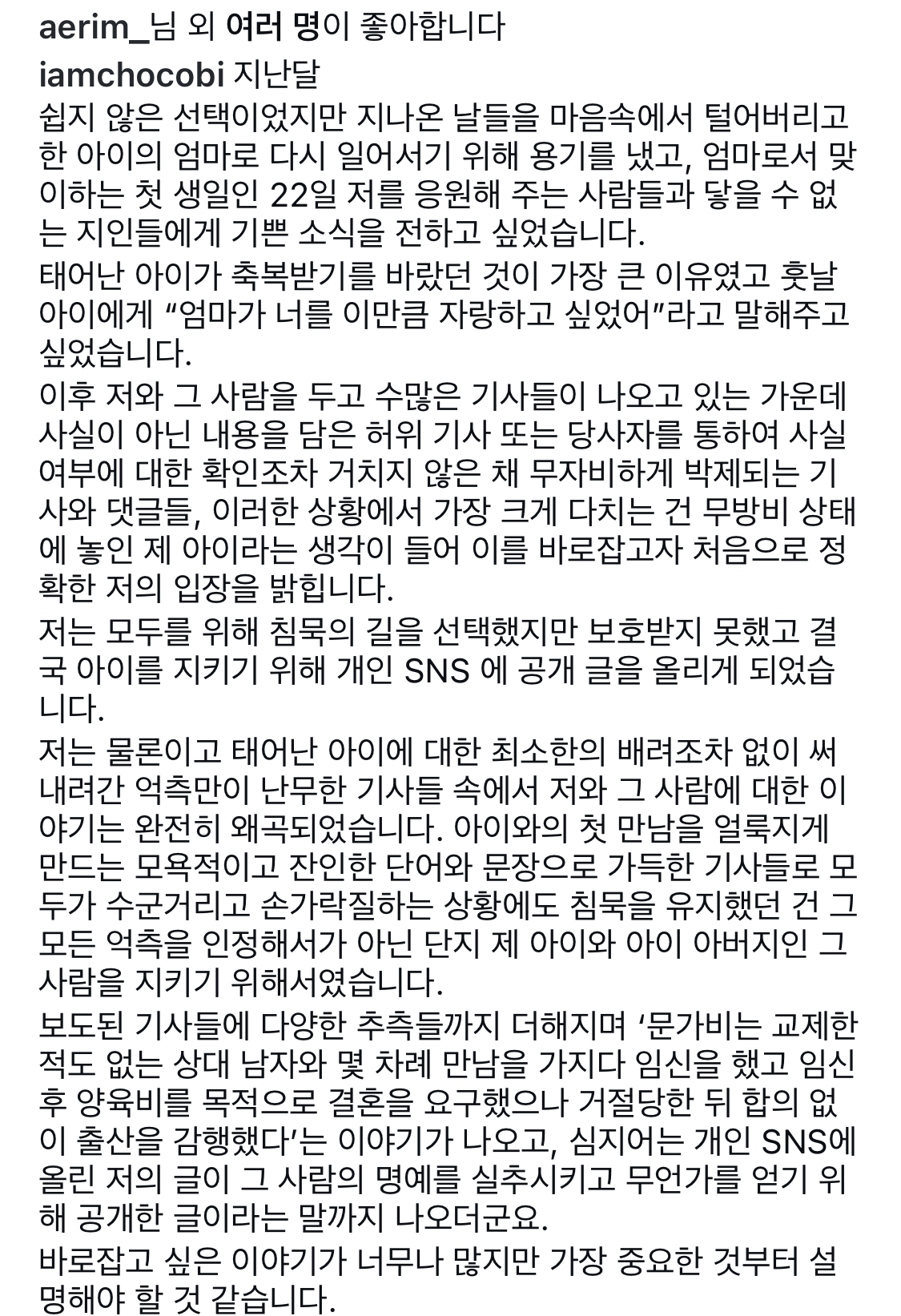 문가비 씨는 인스타그램을 통해 “아이를 지키기 위해 용기를 내어 글을 올리게 됐다”고 전하며, 허위 사실이 난무하는 상황에서 아이를 보호하려는 마음을 드러냈습니다.