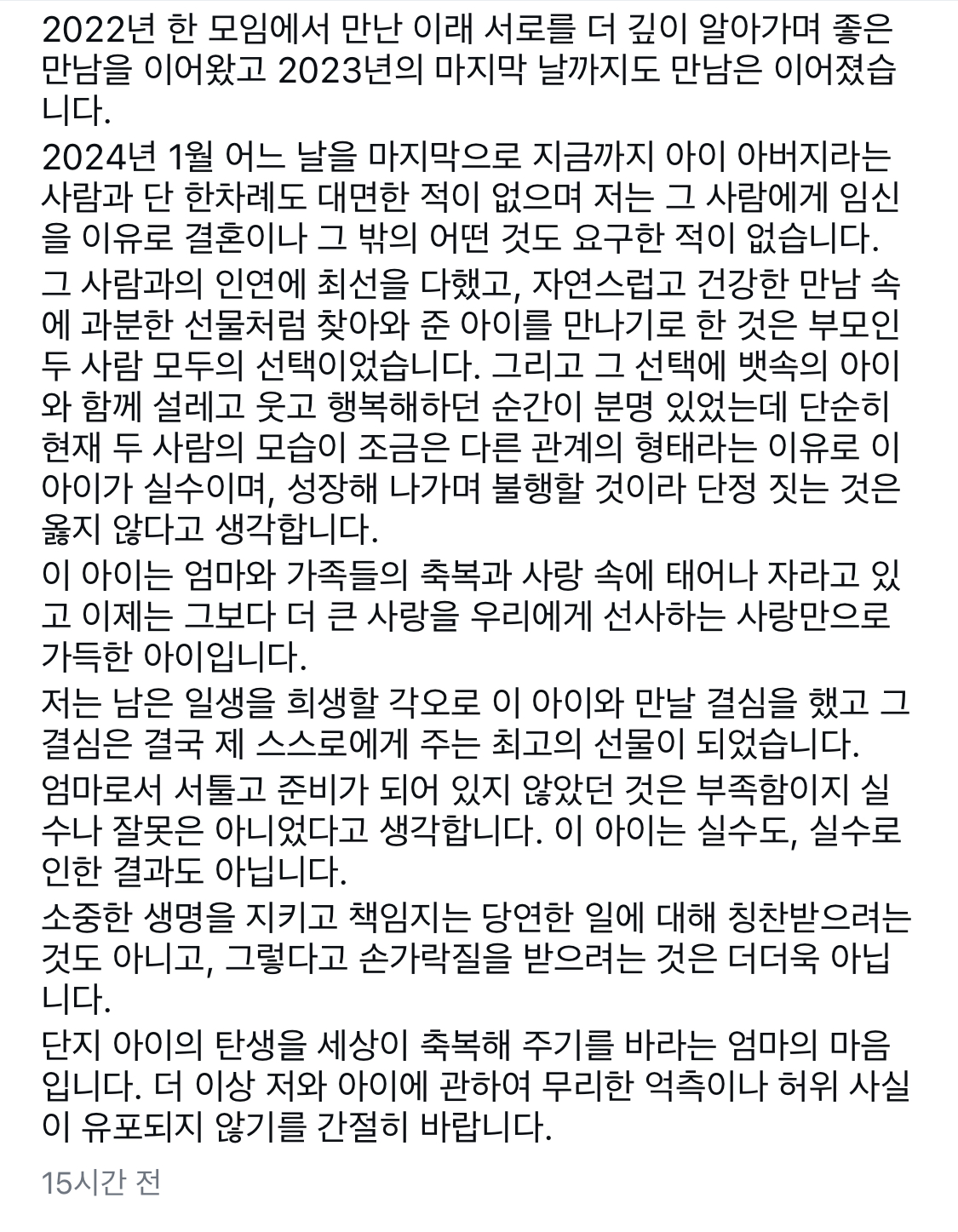문가비 씨는 “아이는 축복과 사랑 속에 자라고 있으며, 아이의 탄생을 세상이 축복해 주기를 바란다”며, 허위 사실의 유포를 멈춰줄 것을 간절히 요청했습니다.