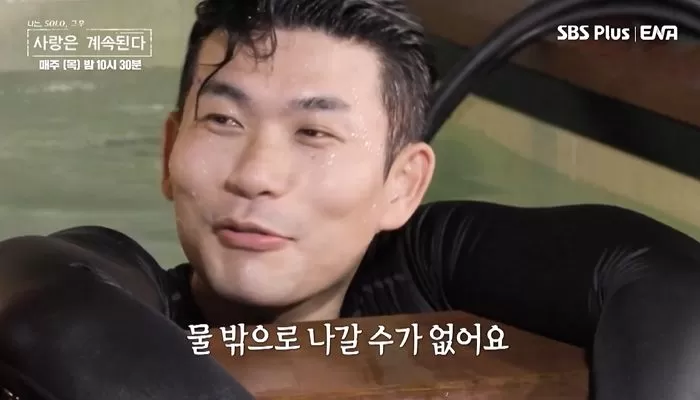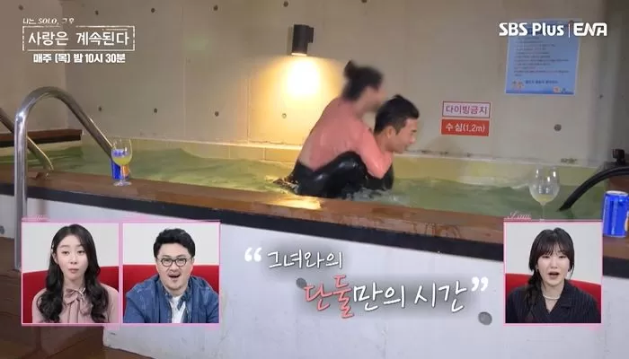 방송 말미 공개된 예고편에는 4기 영수가 한 여성과 작은 수영장에서 아찔한 데이트를 즐기는 모습이 담겼는데 그는 "아.. 이거 어떡하냐. 물 밖으로 나갈 수가 없다"며 민망한 웃음을 지었다.
