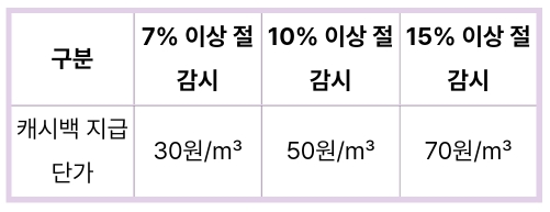 전년 동기간 대비 7%이상 절감시 절감율별로 차등 지급하며, 절감율이 높을수록 캐시백 단가가 높아집니다.