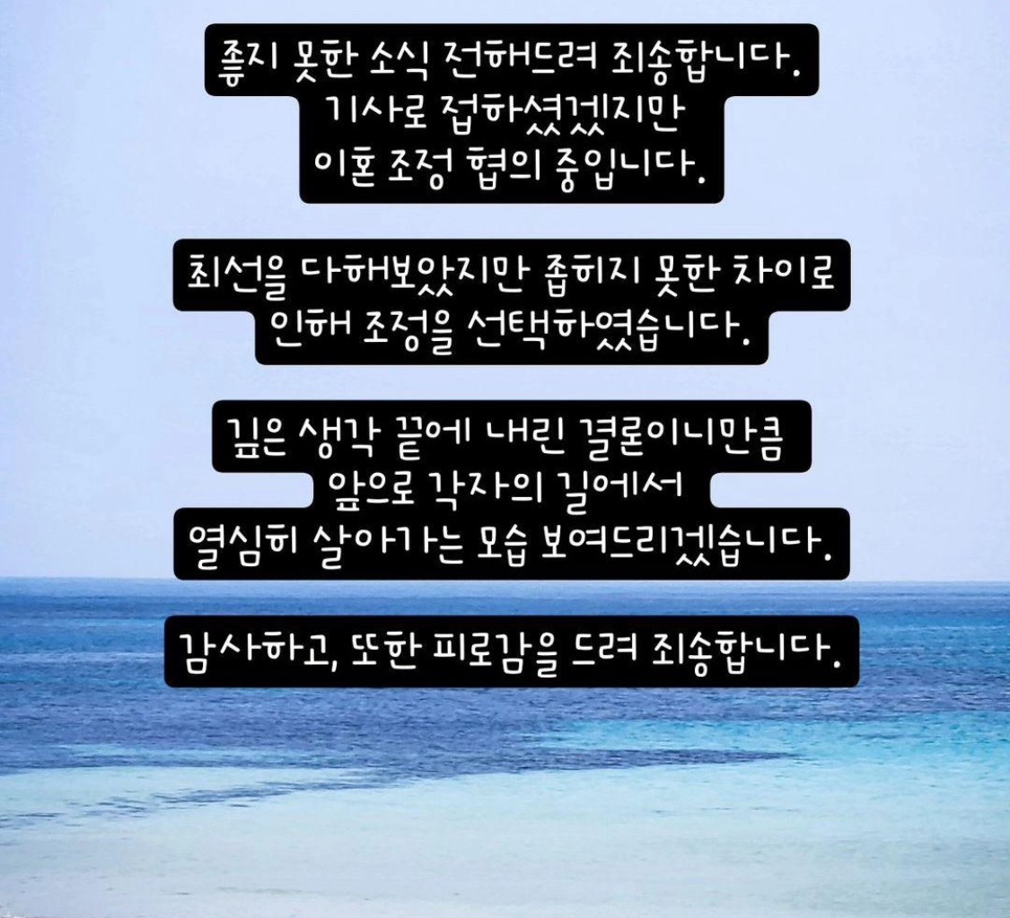 최선을 다해보았지만 좁히지 못한 차이로 인해 조정을 선택했다. 깊은 생각 끝에 내린 결론인 만큼 앞으로 각자의 길에서 열심히 살아가는 모습 보여드리겠다. 감사하고 피로감을 드려 죄송하다"며 인스타그램에 이혼조정 중임을 밝혔다.