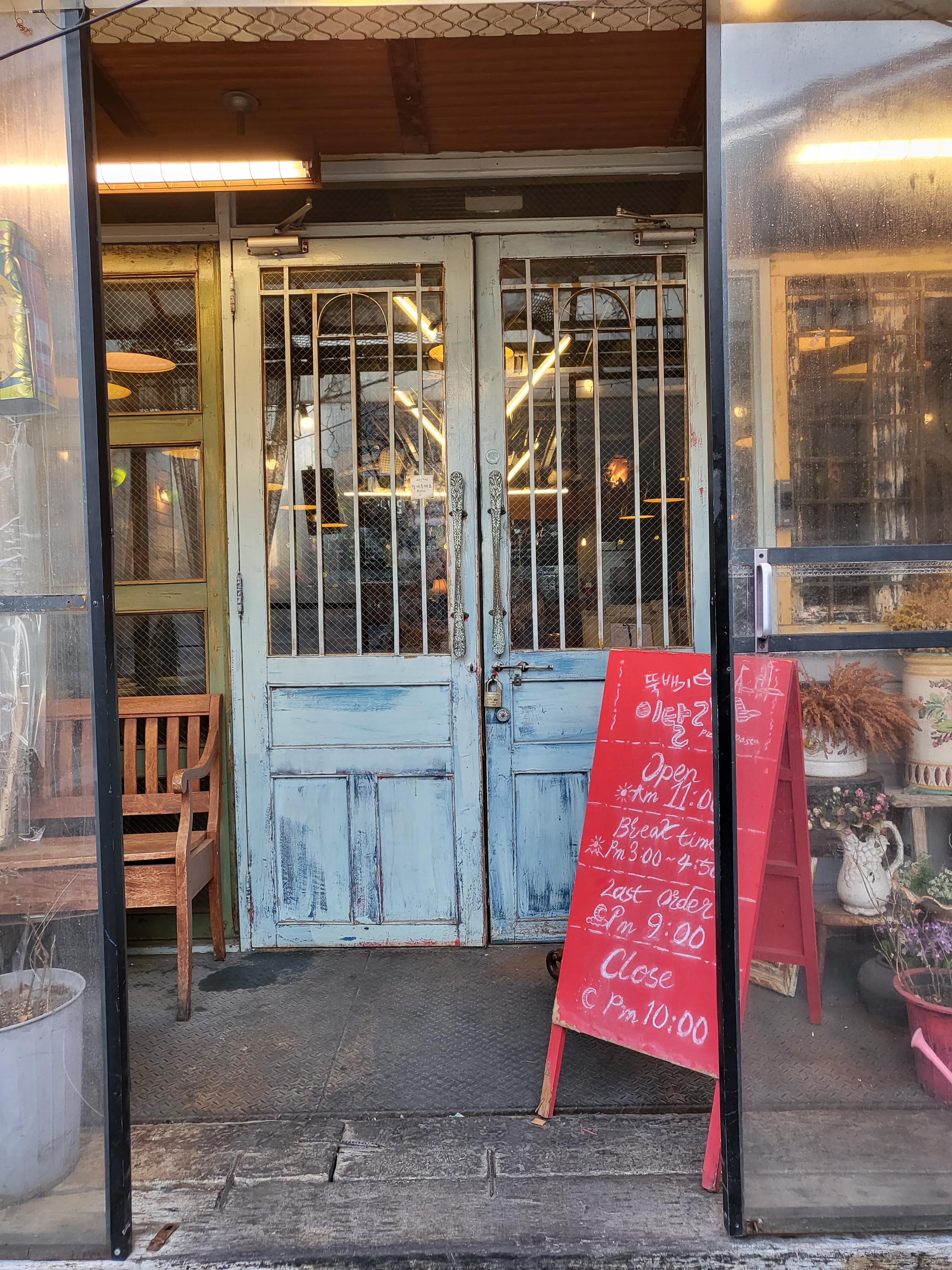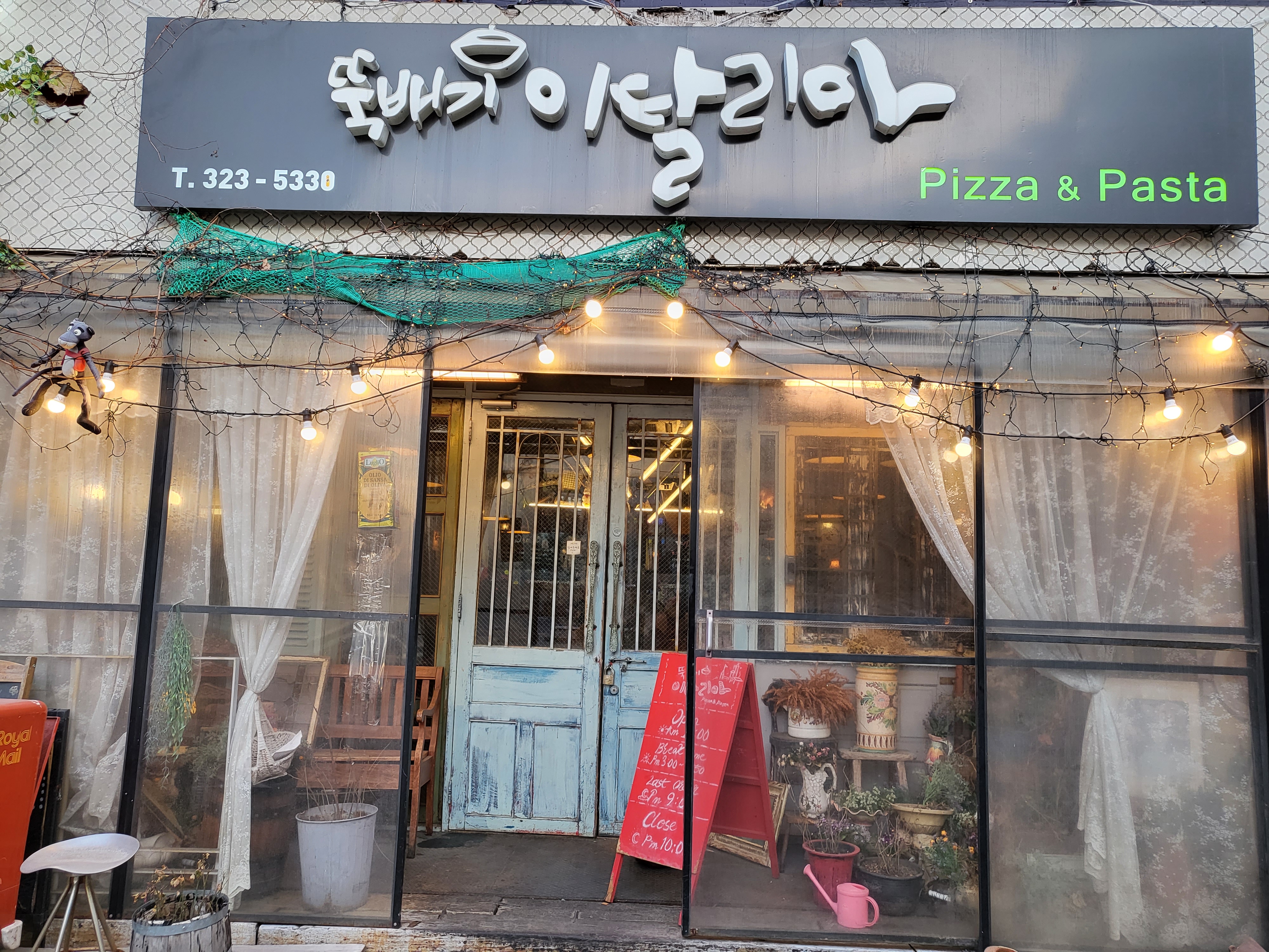 빨간 입간판이 외국스럽다.전체적으로 이탈리아에 있는 파스타 가게처럼 보일려는 의도가 엿보인다.