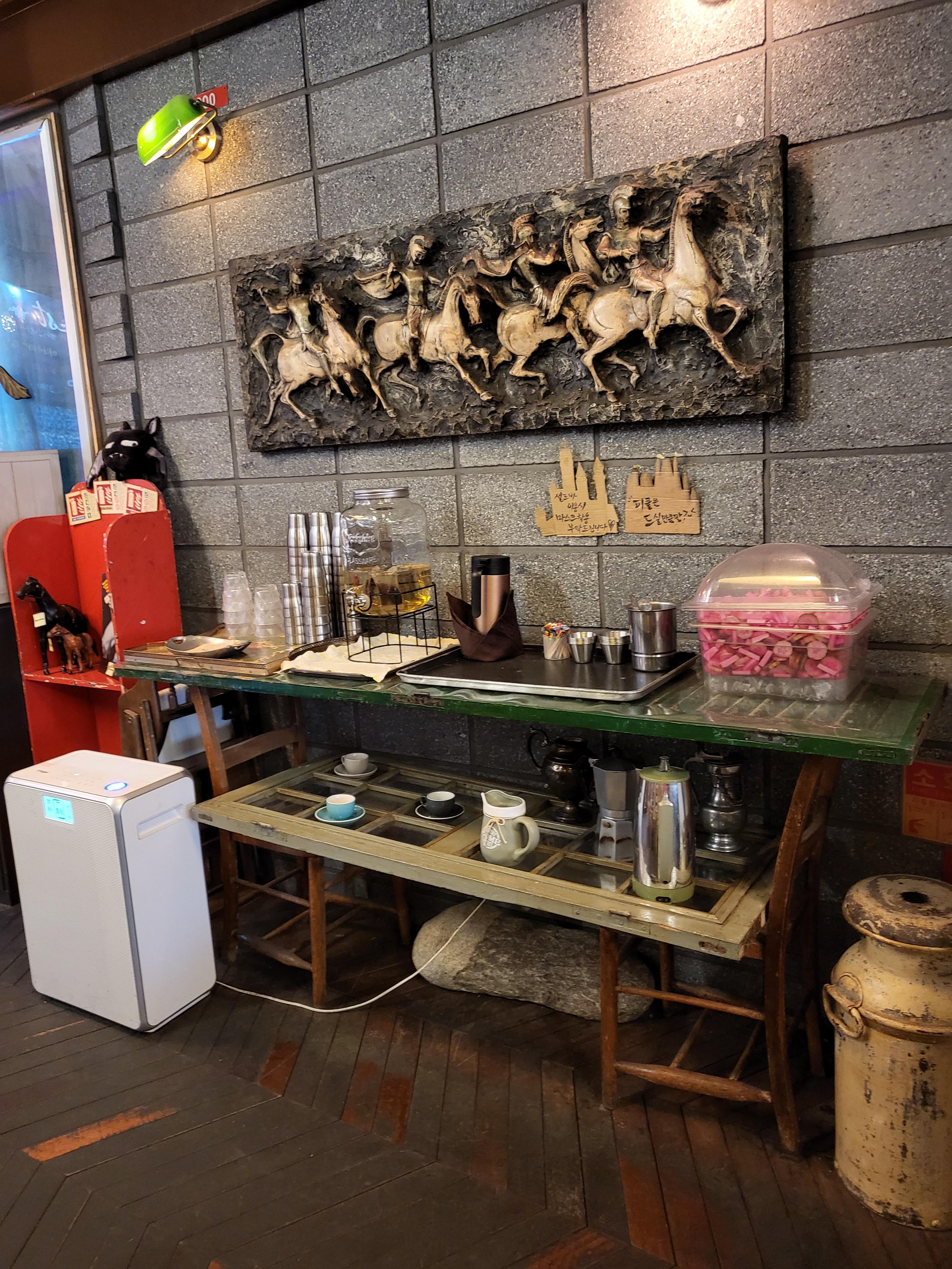 셀프 테이블..피클과 물등을 가져갈 수 있게 꾸며놨다.