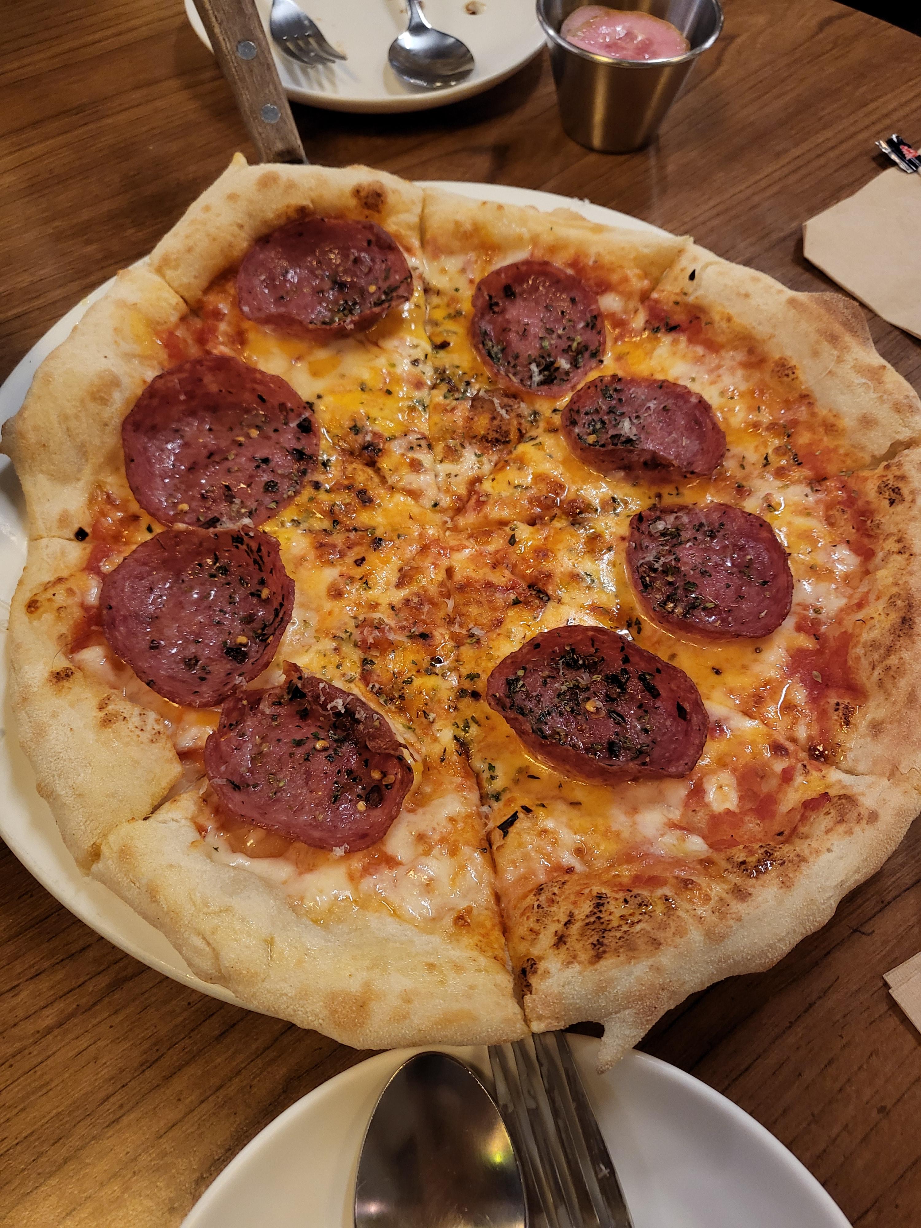 화덕에서 구운 피자로 보이는 살라미 피자♡