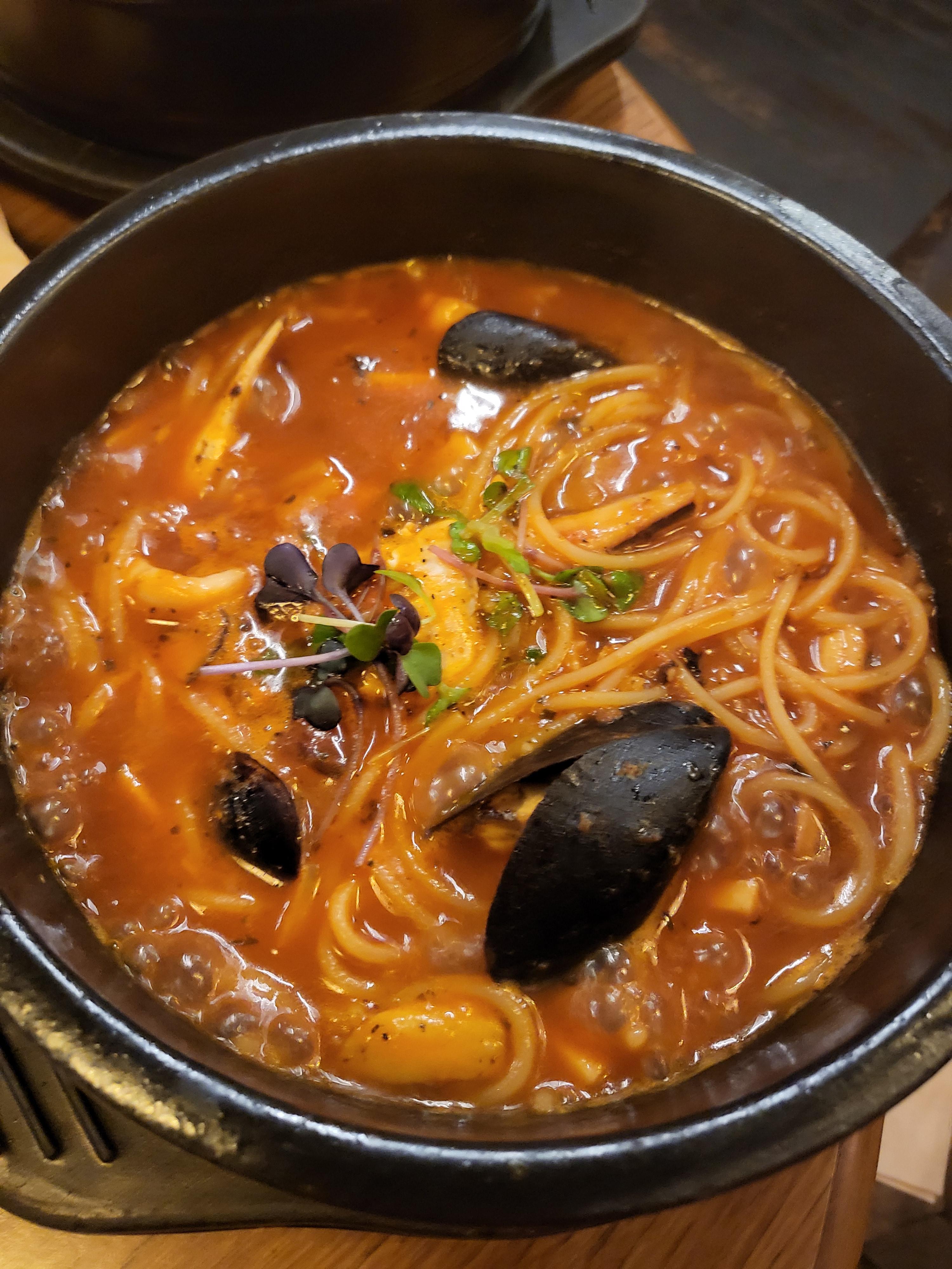 뽀르노는 토마토 해산물 스파게티이다.뚝배기라 물이 더 있고 뜨겁고 얼큰한 맛이다.