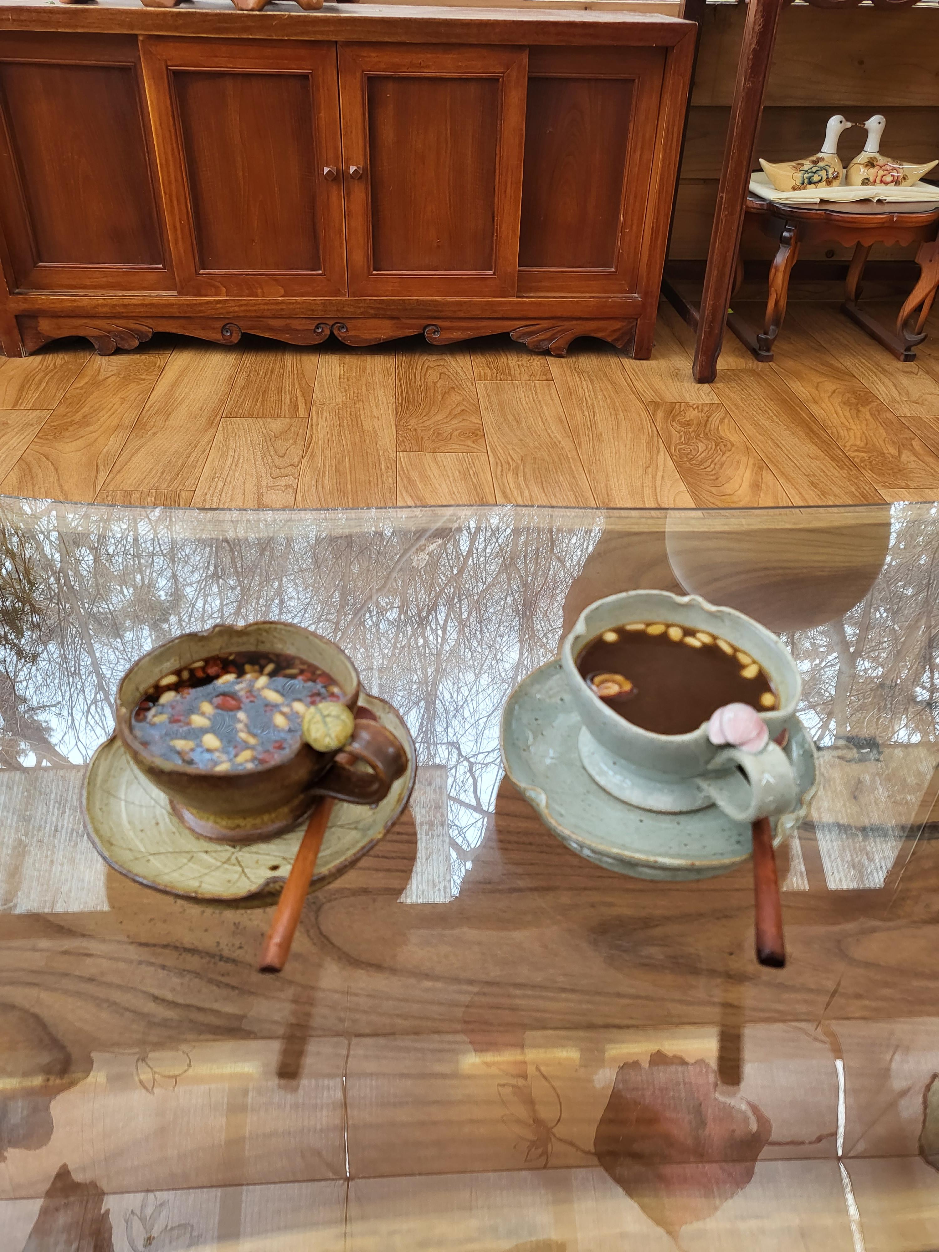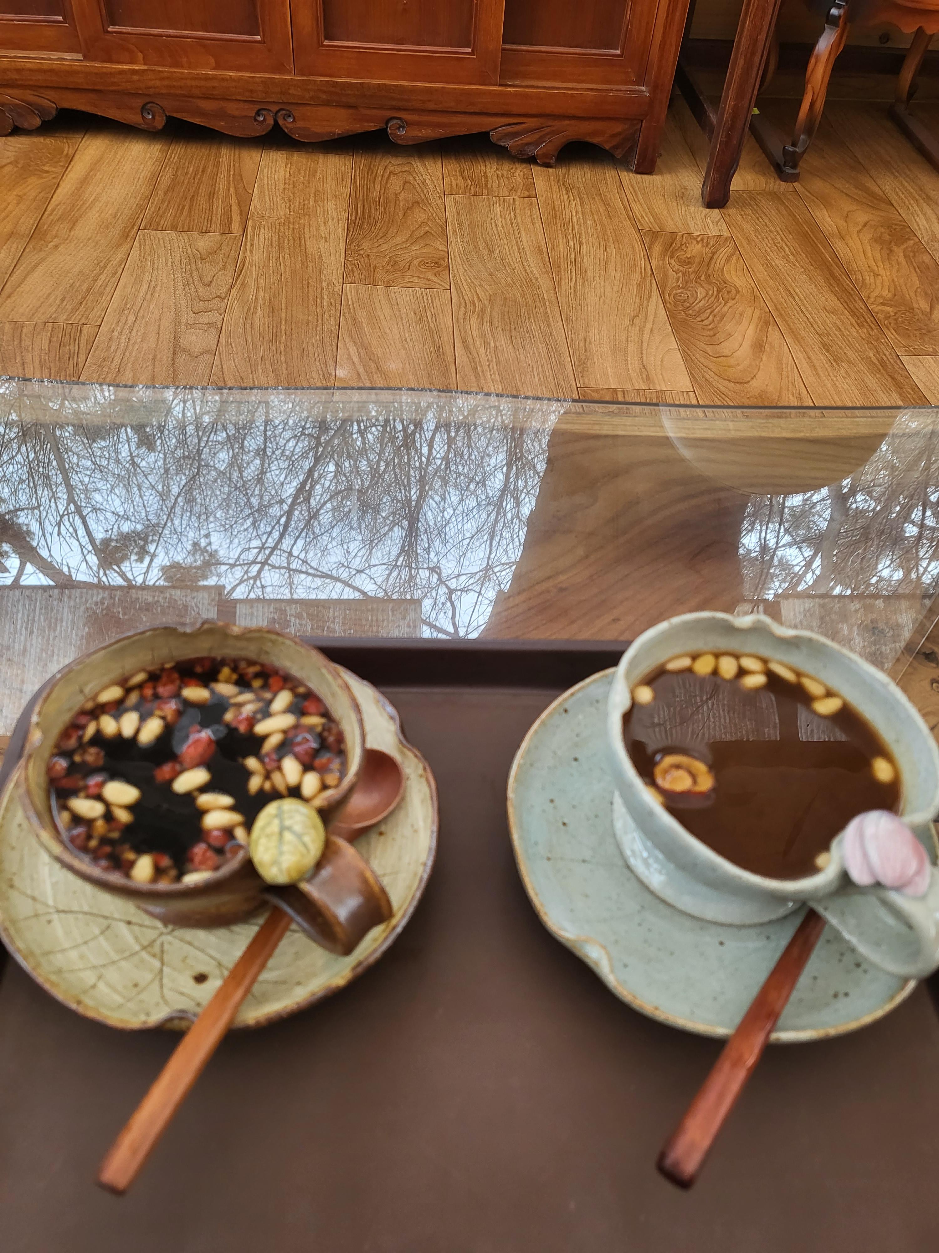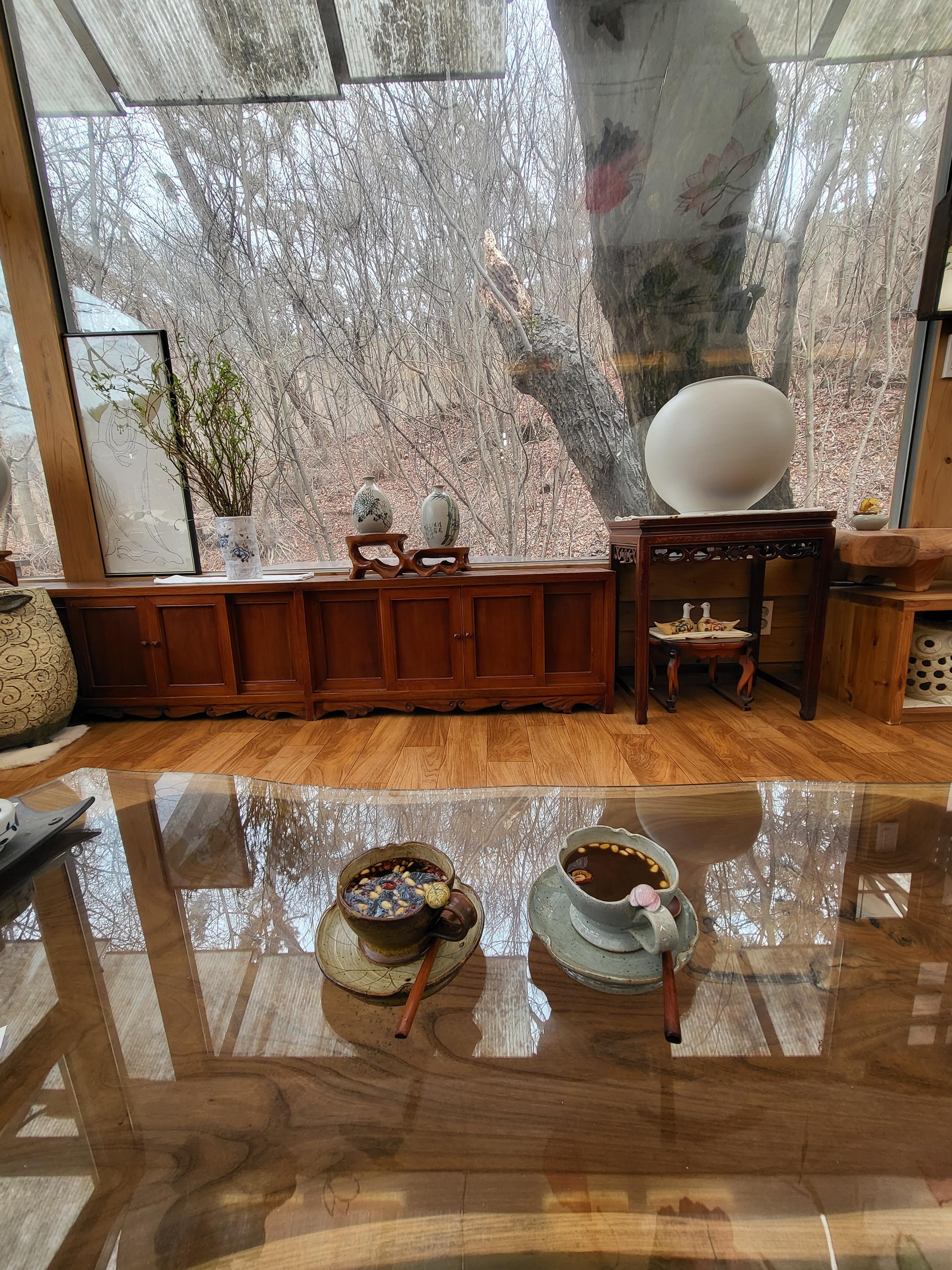 죽림다원은 20여 년 전에 문을 열었다. 신도들이 차를 마시며 잠시 쉬다 가는 휴식 공간이 본격적인 찻집으로 모습을 바꿨다. 나무 탁자로 채운 다원 마당에는 전등사 대조루와 종루가 병풍처럼 드리워진다. 대조루 계단 너머에는 보물로 지정된 대웅보전, 약사전, 범종 등이 수줍게 담겨 있다.