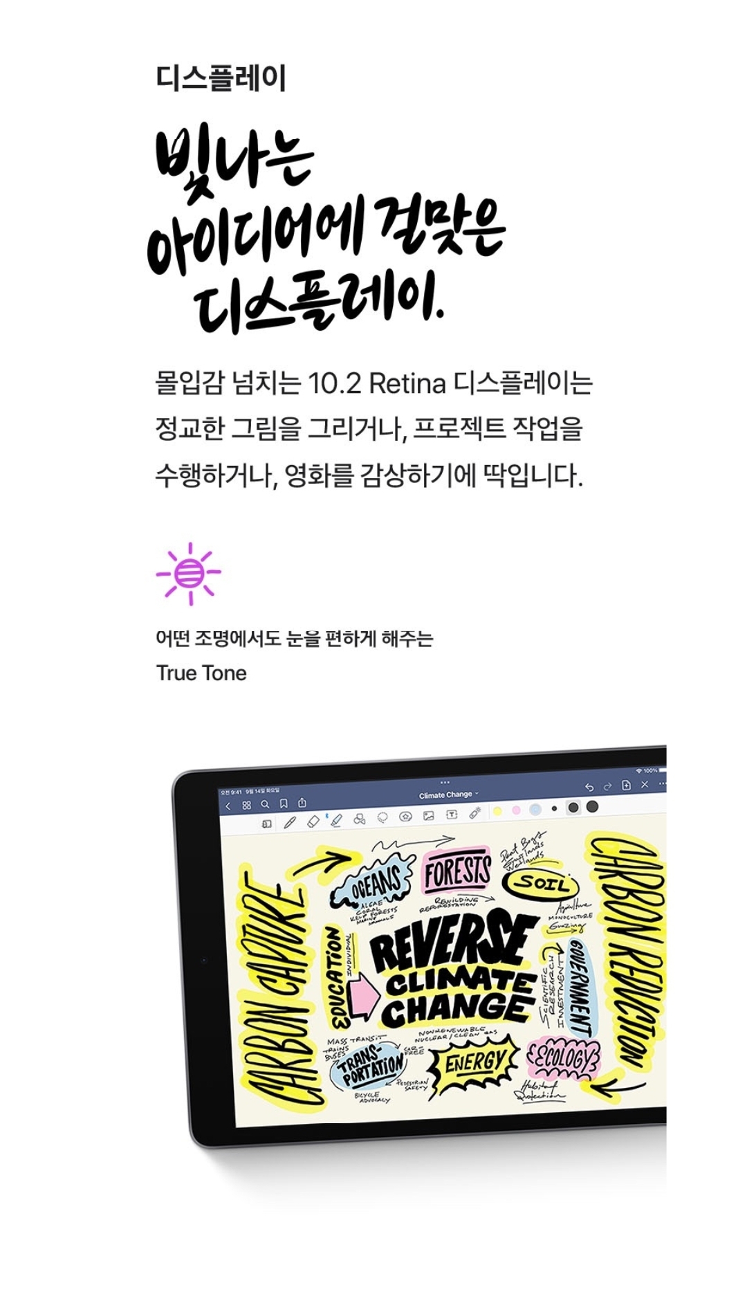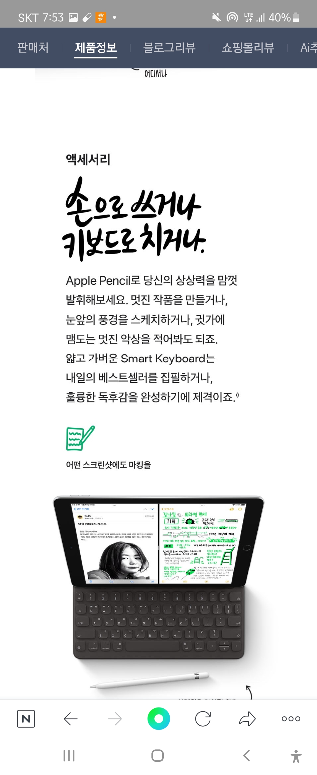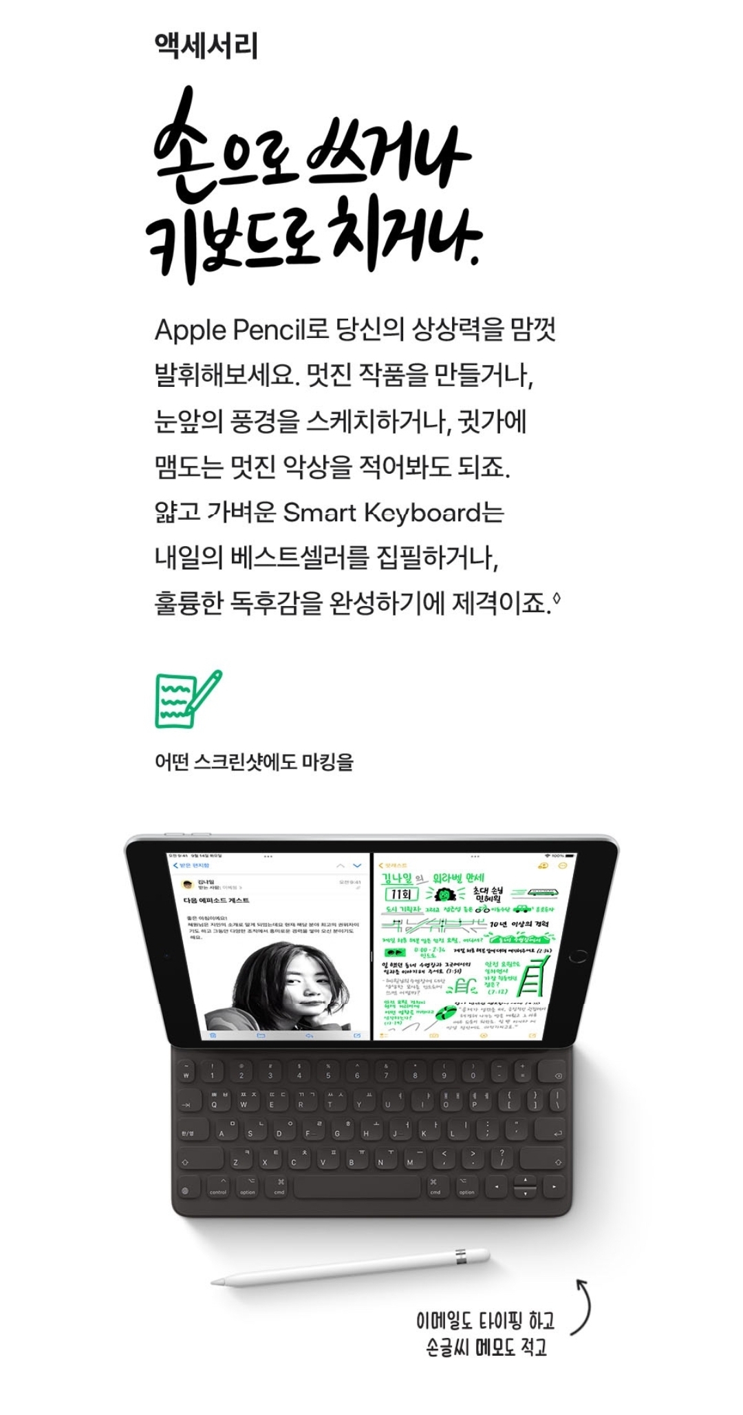그림 위주로 사용하고 싶어서 사각사각 종이느낌 나는 필름지를 보호필름으로 붙여서 쓸때마다 사각사각 소리가 난다. 아직 많이 써보지 않아서 애플펜슬 작동에 미숙하다. 글이 잘써진다. 역시 애플이라고 할만큼 외관도 깔끔하다. 애플의 장점은 밧데리가 오래가고 고장이 별로 없다는게 최대의 장점인듯 하다. 물론 딱 떨어지는 외관은 역시 애플답다.♡♡