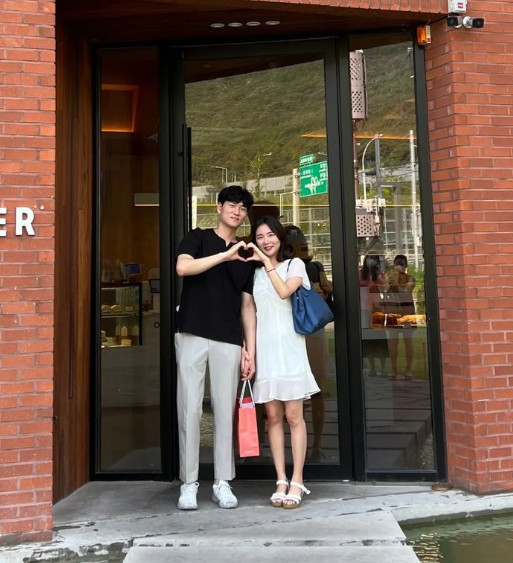 이어진 사진에서 둘은 함께 손으로 하트를 만들며 포즈를 취하고 있다. 또한 가까이 붙어 서서 행복한 미소를 짓고 있다.