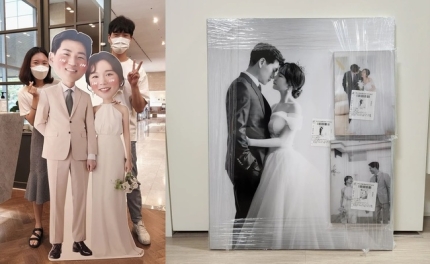 또 이어진 사진에선 자그마한 미니 등신대와 웨딩 사진도 공개됐다. 훈훈한 예비 부부의 모습이 시선을 사로잡는다. 정숙은 이에 대해 "예식장 혼주석 사이에 둘 아크릴 액자와 웨딩앨범"이라며 "4월에 웨딩촬영 하고 6월에 셀렉하고 8월(본식 2주 전)에 수령 완료"라고 설명했다.