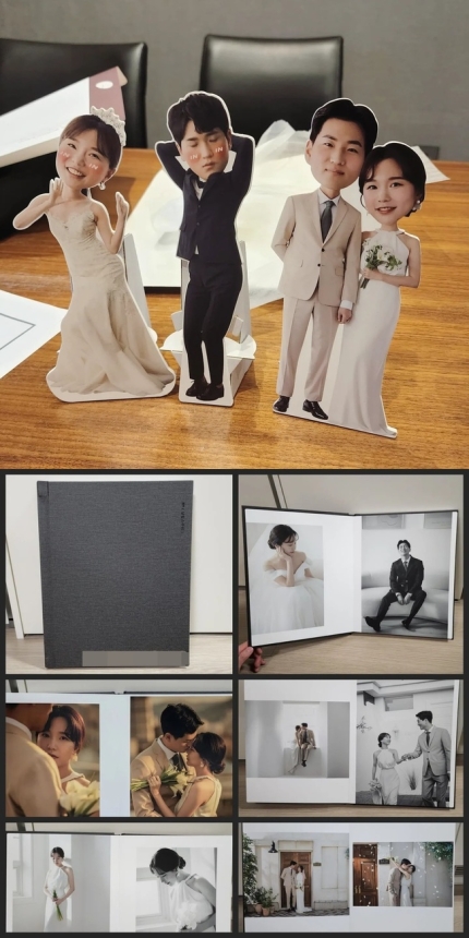 또 이어진 사진에선 자그마한 미니 등신대와 웨딩 사진도 공개됐다. 훈훈한 예비 부부의 모습이 시선을 사로잡는다. 정숙은 이에 대해 "예식장 혼주석 사이에 둘 아크릴 액자와 웨딩앨범"이라며 "4월에 웨딩촬영 하고 6월에 셀렉하고 8월(본식 2주 전)에 수령 완료"라고 설명했다.